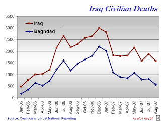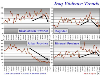 However, the reason I am looking to the Democrats is because I want to see an alternative. I don't buy that enough time has passed to fully gauge the effects of the Petraeus strategy. The charts presented tell a story of trends, and those trends are all over the map. There is certainly credible evidence that things are getting better, however there is not credible evidence that gains won't be lost as the surge winds down.