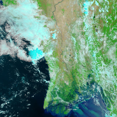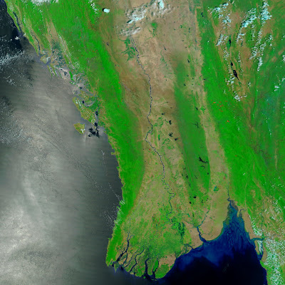 From where I'm sitting, that will probably be how the junta leaders treat Cyclone Nargis. It has turned out to be an incredible disaster, and it has all the signs of getting worse. The International Herald Tribune has a summary of ongoing events.Foreign aid workers in Burma have concluded that as many as 50,000 people died in Saturday’s cyclone, and two to three million are homeless, in a disaster on a scale comparable with the 2004 Indian Ocean tsunami.As the hours pass, the death toll is expected to jump considerably. These two satellite images from spaceref.com tell the story, the first from April 15, 2024 and the second from May 5, 2008. These images are provided from the Moderate Resolution Imaging Spectroradiometer (MODIS) on NASA's Terra satellite. They use a combination of visible and infrared light to make floodwaters obvious. According to spaceref.com, water is blue or nearly black, vegetation is bright green, bare ground is tan, and clouds are white or light blue. Click for better resolution.