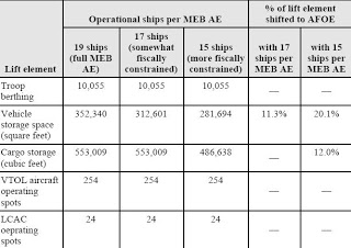 To arrive at a more fiscally constrained goal, the Marine Corps reduced the above 19-ship total to 17 operational ships: 5 LHAs/LHDs, 7 LSD-41/49s, and 5 LPD-17s. This 17-ship force requires about 11% of the MEB AE’s vehicles to be shifted to the AFOE, which creates a degree of operational risk. This 17-ship force was presented to Navy officials in mid-2007.