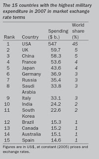 The USA’s military spending accounted for 45 per cent of the world total in 2007, followed by the UK, China, France and Japan, with 4-5 per cent each. Since 2001 US military expenditure has increased by 59 per cent in real terms, principally because of massive spending on military operations in Afghanistan and Iraq, but also because of increases in the ‘base’ defence budget. By 2007, US spending was higher than at any time since World War II. However, because of the growth of the US economy and of total US Government spending, the economic and financial burden of military spending (i.e. its share of GDP and of total US Government outlays) is lower now than during previous peak spending years in the post-World War II period.Some perspective. The GDP of the United States is 4.25x that of China, 5x that of the UK, and 5.5x more than France. Comparing the GDP of the US and China, the difference is around 10 trillion dollars annually.
