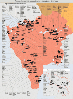 Over The Loons Nest also pulled the map below from Warfare.ru and gave some commentary.According to this website there's a troop level of 185'000 Air Force troops and 322'000 Ground troops, plus some more logistics and other the Black Sea fleet in the North Caucasus Military District. Most divisions have taken part in the Chechen wars.It is hard to tell how old this map is, but Google Earth does confirm troops in most of these locations as of the last satellite updates. For those who want to match with Google Earth and verify, turn the map of Georgia in Google Earth so that the Caspian Sea is straight up and down on the right side. It will like up and you can find most of the unit locations.