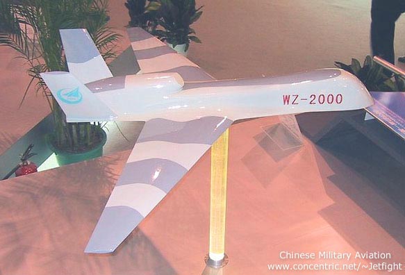 Also known as WZ-9, this multi-purpose stealth UAV has been under development at GAIC since 1999. Its stealth design features a fuselage with a flat bottom surface blended seamlessly with long swept wings to reduce RCS. A single turbofan engine (WS-11) sits on top of the tail section with its intake shielded by the wing section and its exhaust nozzle shielded by two "V" shaped tail fins extending 30-40° outwards to reduce both radar and IR signatures. WZ-2000 carries a large satellite communication antenna inside its head bulge for real-time transmission of images and ELINT data back to the ground control station. It also carries EO sensors such as thermal imaging camera or synthetic aperture radar under its nose. WZ-2000 looks generally similar to American Global Hawk long-range stealth UAV but has a smaller size and shorter range. Some specifications: length 7.5m, wingspan 9.8m, max TO weight 1.7t, mission payload 80kg, max level speed 800km/h, ceiling 18,000m, combat radius 800km, loitering time 3hr. The development of this UAV would also provide valuable experience for future stealth cruise missiles. WZ-9A first flew on December 26, 2003. An improved version (WZ-9B?) might have flown by the end of 2005. It was reported that WZ-9 entered limited service with PLA Department of Chief Staff in 2007 and conducts only strategic reconnaissance missions. In addition, CAC is also developing a similar but probably more capable stealth UAV. A prototype had been built by April 2008. High speed taxiing took place in September 2008. Its designation may be called Sky Wing.Old model from 2004 Zhuahi Airshow. Additional images here.