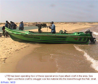 The ability to swarm combatants and other ships with small boats means that whatever weapon system used to combat them must be able to put out volume fires cheaply without incurring too large a logistics penalty for reconstitution - in other words, full-up VLS rounds are out. As Galrahn and others have said here, crewed small mounts (and regular training) are probably the cheapest and quickest answer to this problem. Dedicated CIWS modes are another. If we have to have electromagnetic weapons, it would be interesting to see if one can be devised that interferes with small, cheap electronic ignitions like those used in compact outboard motors. (File photo of LTTE boat from Sri Lankan MOD via lankalibrary.com)