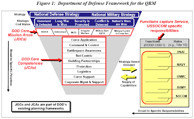 I could go on, but will stop there. It is somewhat revealing that immediately after this slide, rather than offering any vision into these strategic end states, the document immediately goes into 'DOD Core Mission Areas (JOCs)'. While this document and this authoring group were not tasked with coming up with the strategic end states or higher strategy, I'd like to know they read them and understood them. I have the strong impression, from this doc, that while they did that, even they had difficulty working the means-ends chain properly through from the top level to their JOCs/JCAs - and this is a bit of a handwave to get them past the difficult part. Essentially, while I don't take issue here with any of the document's contents, I do take issue with the fact that it seems to be disconnected from the strategic level by anything other than primitive word-matching.