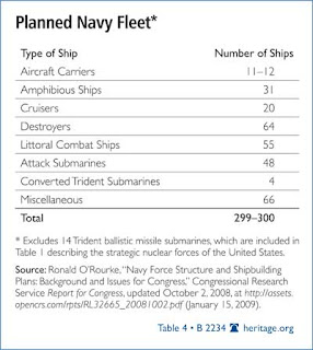 The Heritage Foundation has released a report titled Quadrennial Defense Review: Building Blocks for National Defense. The key point that enables the report is the requirement for 4% of GDP spending. Quoted are the parts specific to the Navy. First the summery.The U.S. Navy's primary responsibility is to defend freedom of the high seas, including protecting sea lines of communications. It shares responsibility with the Marine Corps for projecting power from ship to shore in the littorals.Ultimately, besides the photo above, this is all the detail provided to explain the position.