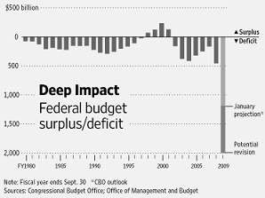 Are you kidding me? How can anyone defend this? This would be a 16% increase in the national debt... in a single year. Make sure you take a hard look at that graph, that bar on the right isn't a border, it is part of the graph.President Obama’s new budget blueprint estimates a stunning deficit of $1.75 trillion for the current fiscal year, which began five months ago, then lays out a wrenching change of course as he seeks to fund his own priorities while stanching the flow of red ink.Hard choices? The allowance for public dishonesty by these folks is scary. This isn't fiscal discipline, this is blatant disregard of the entire concept of a budget. How in the world can people claim to be fixing an economic problem when these folks appear to have no apparent understanding regarding the value of money?