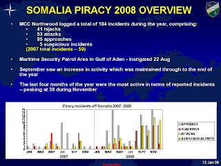 Regardless, while three ships so far into 2009 is much fewer than the number of ships hijacked in the last months of 2008, it still represents an increase, not decrease in piracy. In January of 2008 there were 0 ships hijacked, and in February of 2008 there was only 1. There were also 0 in March of 2008, and only one in April. Indeed there are already more hijackings this year off the coast of Somalia than there were in the first 4 months of 2008, and we are still a long way to May. One of the reasons there are fewer hijackings this time of year is due to higher winds and high sea states.