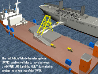 The Test Article Vehicle Transfer System (TAVTS) will demonstrate the transfer of vehicles between a surrogate Maritime Pre-positioning Force (Future) (MPF(F)) Mobile Landing Platform (MLP) ship and a side port platform on a large medium-speed roll-on/roll-off (LMSR) ship.
