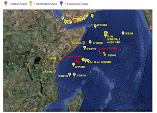 EagleOne has an interesting map noting how the pirate attacks appear to be shifting to the south and east, although there is still plenty of evidence that attacks are occurring frequently in the north as well. IMB has seen the pattern developing as well, and is calling for the coalition to extend its coverage area.A maritime watchdog Tuesday urged an international naval coalition patrolling the waters off northern Somalia to extend its watch to the country's eastern and southern coasts.The problem is, there are no more ships. The international community has been able to limit the number of hijackings by creating transit lanes for convoys and organizing the shipping community.