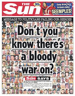 Writing about Afghanistan today, this article in The Sun (every Americans favorite British tabloid) has a pretty powerful picture and a handful of combustive questions and sharp statements for the Whitehall crowd regarding Afghanistan policy. It might be one of the boldest statements in journalism that questions an official government war policy I have seen since 9/11, and probably the strongest use of journalism in terms of questioning war policy since the Falklands.Former President Bush was hit over the head pretty hard several times in the tough 2005-2006 timeframe for Iraq, but I don't recall ever reading anything that gets anywhere close to the tough nature of that article on any major media publication. Keep scrolling, keep reading...
