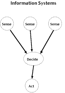 Today sense, decide, and act functions of the information system are relatively contained in form and function to an organization no larger than a strike group, but more specifically often limited to a few sensor platforms, a few strike platforms, and either a Hawkeye or CIC. With additional capabilities like the Littoral Combat Ship and associated modules, P-8, BAMS, etc, and continued evolution of combat and communication systems - the US Navy hopes to extend interoperability in both scale and scope throughout the entire Navy battle force network.