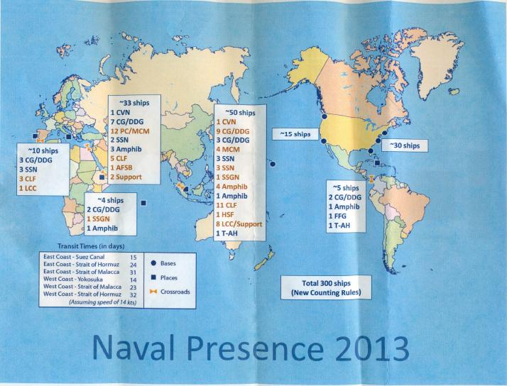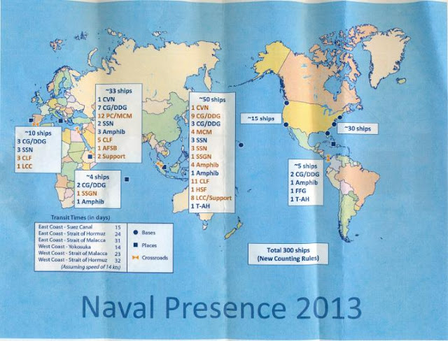 These slides from OPNAV were passed around several months ago as an example of the pivot to Asia. Some have identified these slides as representative of the slides presented at a recent CNO press conference. The first slide begins with the expected Naval Presence of 2013.